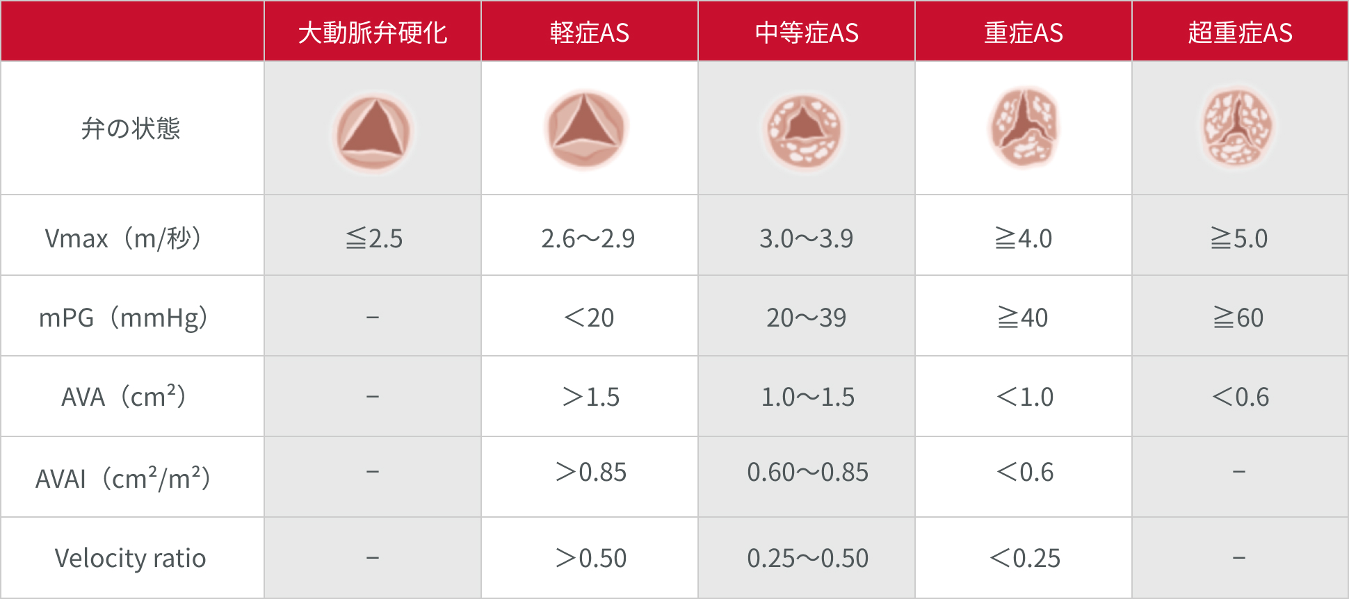 ASの診断の中心は心エコー図検査であり、心エコー図検査結果によって重症度評価を行います。